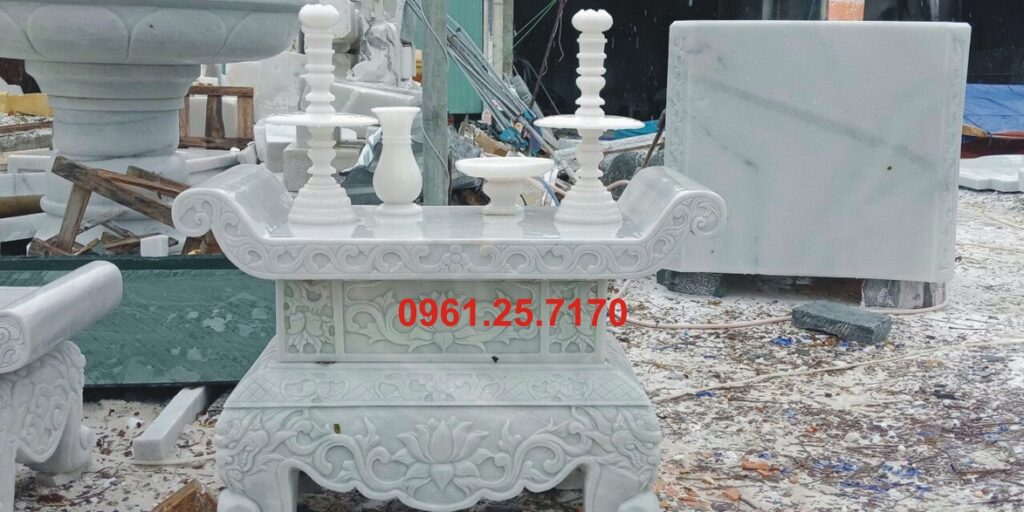 Bát hương đá trắng cẩm thạch là vật phẩm thờ cúng được chế tác từ đá cẩm thạch tự nhiên (marble), có màu trắng tinh khiết, vân đá nhẹ, mang ý nghĩa thanh cao và trang nghiêm trong không gian tâm linh.